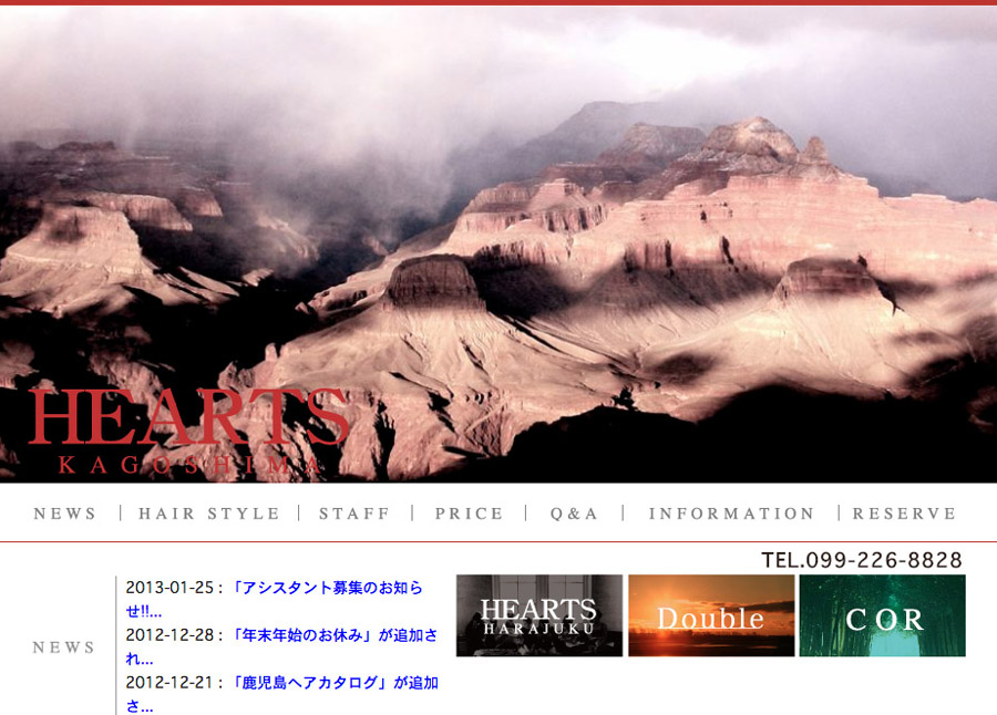 鹿児島 HEARTS ハーツ 美容室 Posted date:2013/02/03 http://hearts-k.net/ 鹿児島 HEARTS ハーツ 美容室 鹿児島 HEARTS ハーツ 美容室のホームページ 大きい写真の表示が印象的です。 PAGE LINK !