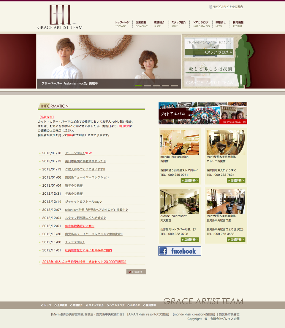 鹿児島市美容室【Men’s髪飛&美容室南風】【 AMAN 】【 monde 】 | 有限会社グレイス企画のホームページ Posted date:2013/02/02 http://happy-minamikaze-aman.com/ 鹿児島市の美容室 グレイスアーティストチーム すごく分かりやすく。サクサク動きすっきりしたホームページ。やさしさを感じるデザイン。 PAGE LINK !