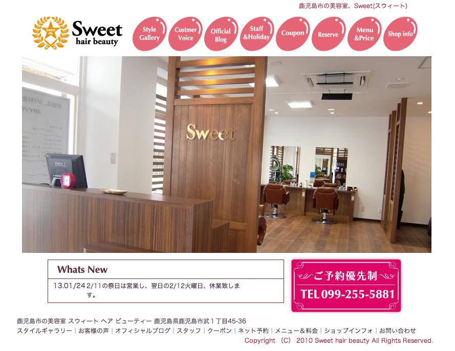 鹿児島市美容室 Sweet「スウィート ヘアービューティー」 Posted date:2013/02/02 http://www.sweet-hair.com/ 鹿児島市の美容室、Sweet(スウィート)のホームページ 店名の通りピンク色をポイントに取り入れたホームページデザイン。かわいいですね。 PAGE LINK !
