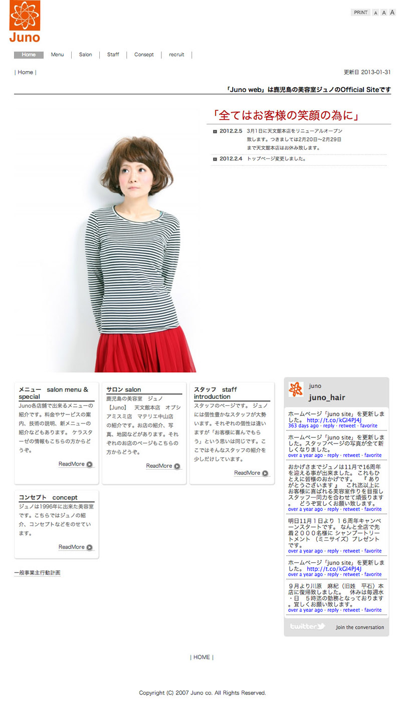 鹿児島 美容室 Juno ジュノ Posted date:2013/02/02 http://www.juno-hair.com/ 鹿児島 美容室 Juno ジュノ シンプルでどこかキュートなかわいらしさがあるホームページ。 PAGE LINK !